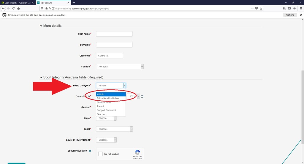 If you are an Athlete completing the Sign-Up, select “Athlete” from the drop down category listed under the Basic Category (see red arrow below).