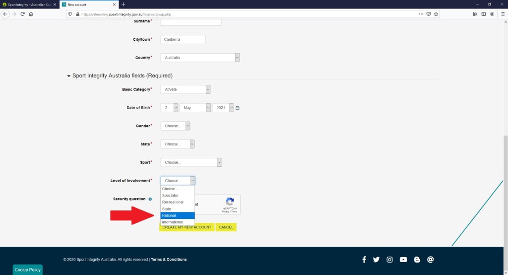 Further down, under the “Level of Involvement” section you can select “National” if you will be competing at the Nationals (see red arrow below). The level of involvement determines which courses you are required to do. See relevant graphs under the Education Plan (pages 5-7) for more details on required and recommended eLearning courses.