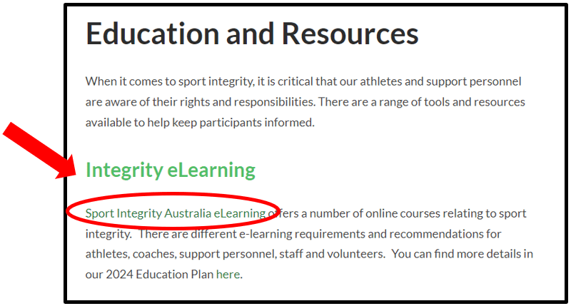 Once on the ACF “Education and Resources” webpage, scroll down to the section titled “Integrity eLearning” as shown in the image below. Click on the hyperlink “Sport Integrity Australia eLearning” circled in red below in the image. This will take you to the Sign up and Log in page for Sport Integrity Australia’s courses.