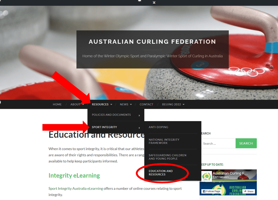 To find the Sport Integrity Australia website link for the eLearning courses click on the Resources tab on the Australian Curling Federation website. Select “Sport Integrity” from the drop down menu and then from the second drop down menu select “Education and Resources”.