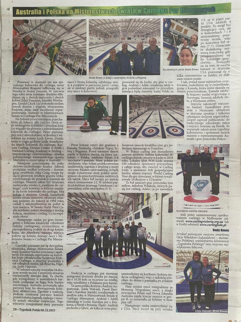 5 December 2023 – From Polish Weekly (Tygodnik Polski) the Australian Mixed Fours team of Matt Panoussi, Jennifer Westhagen, Gerald Chick and Beata Bowes were featured for recently placing 5th at the 2023 World Mixed Curling Championships in Aberdeen Scotland. Their ranking is the highest an Australian Mixed Fours team has placed at this World event.