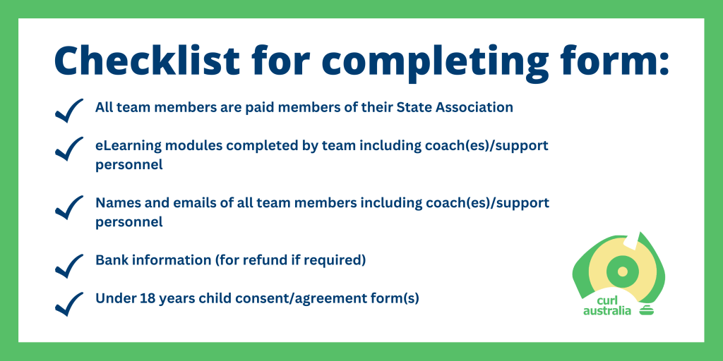 The nomination process has gone digital!! As part of our effort to streamline the nomination process, teams will now complete the form online. See the checklist above for the information required before nominating. Under 18 years old players must have a consent form completed and emailed to: auscurling.nationals@gmail.com. Consent form can be found HERE.