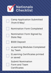 - If there is more than one team nominating for a discipline but less than four teams in total for that discipline, the teams will be required to deposit a further $500 (for a total of $1000) per team to secure their nomination. The requirement for this second deposit will be included in the 15 June competition schedule release and payment required by 22 June. Teams that do not show up to the competition to compete in earnest will forfeit their entire deposit of $1000. After the competition is finished, teams will be reimbursed for the excess deposit amount (if any) once costs have been finalised.